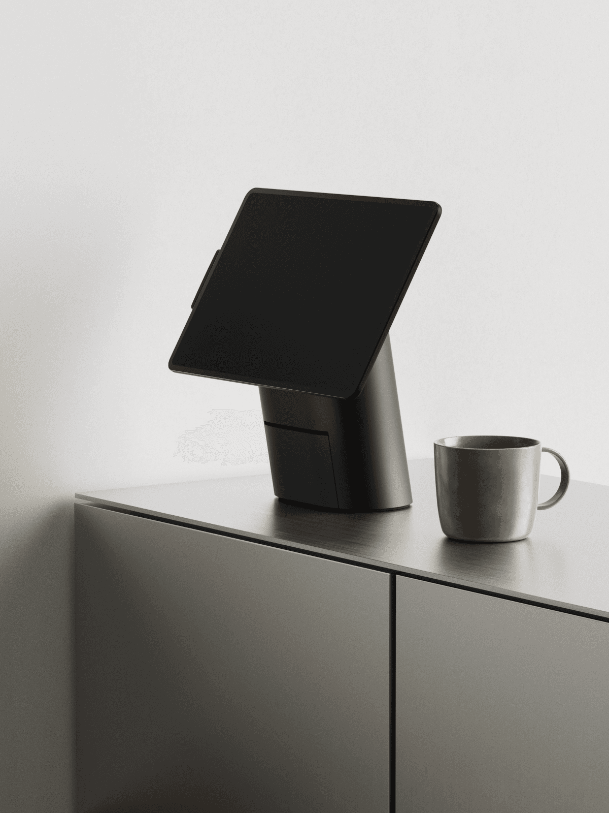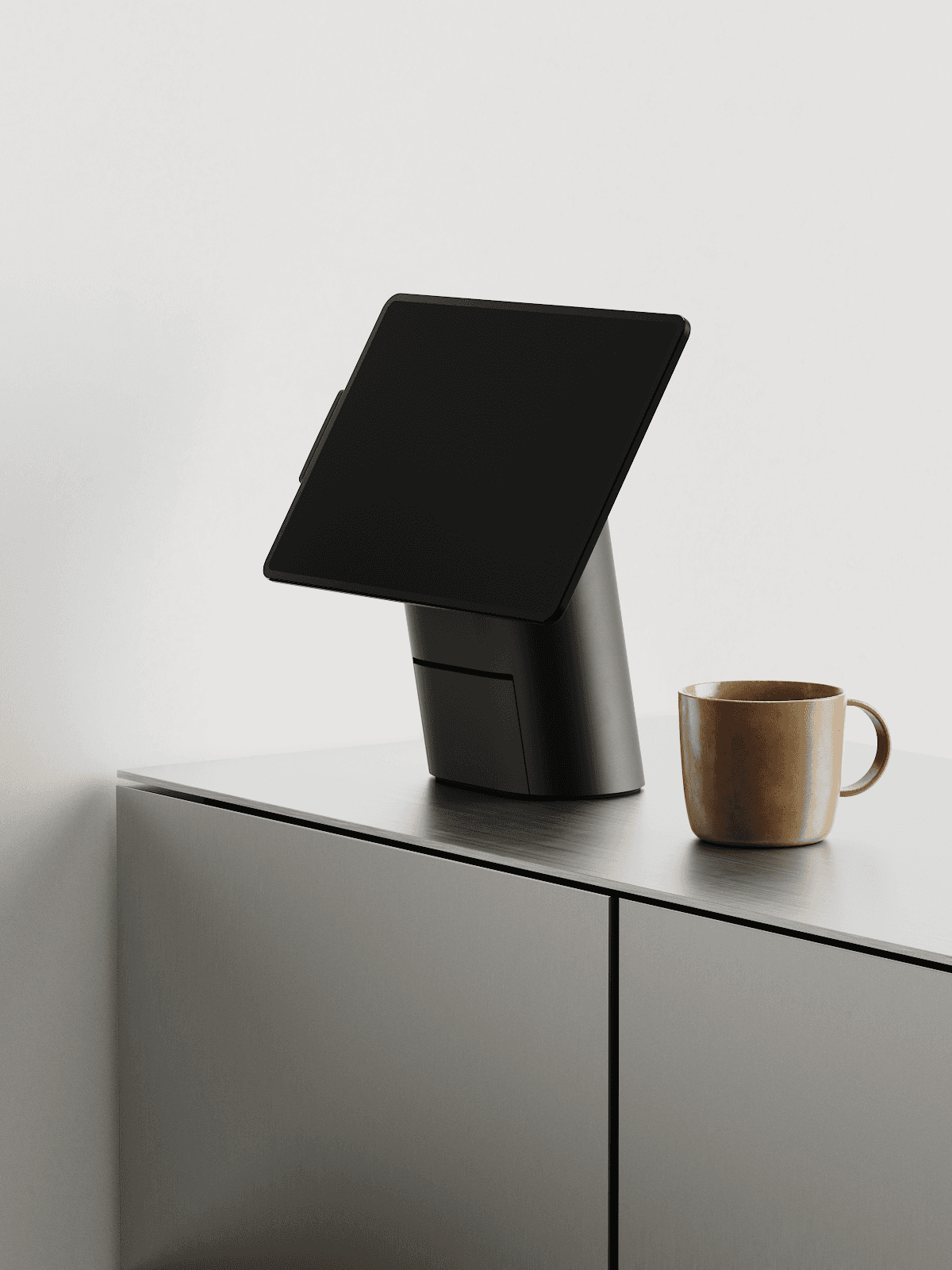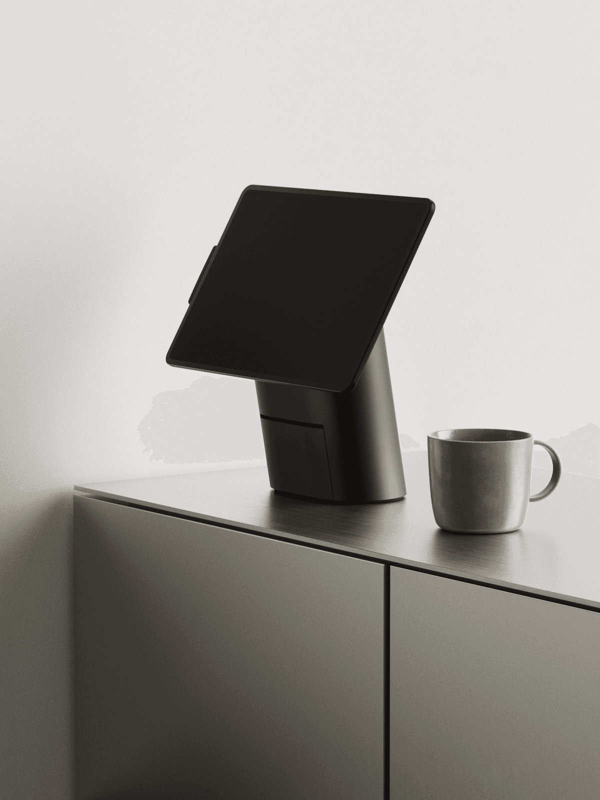 It allows any restaurant with a tablet to process contactless payments and to print receipts on site. The tablet is mounted on a stand, a machined aluminium column that houses the printer. This forward-leaning shaft ensures stability when tapping the display.